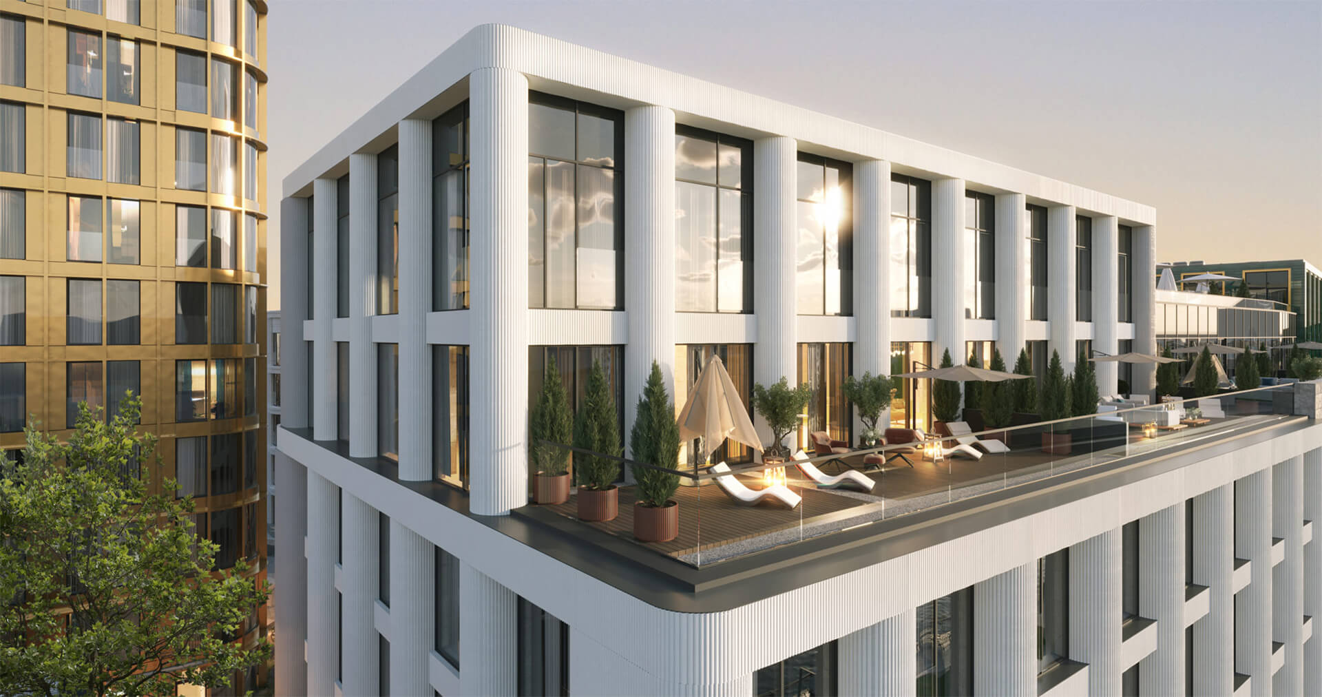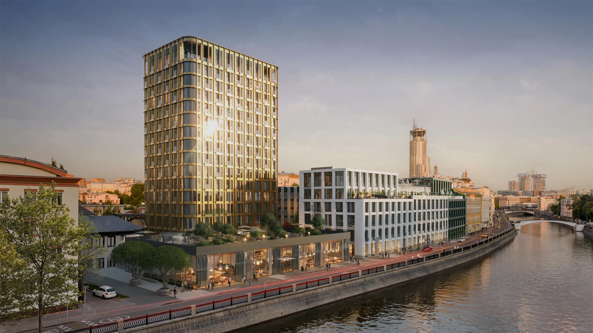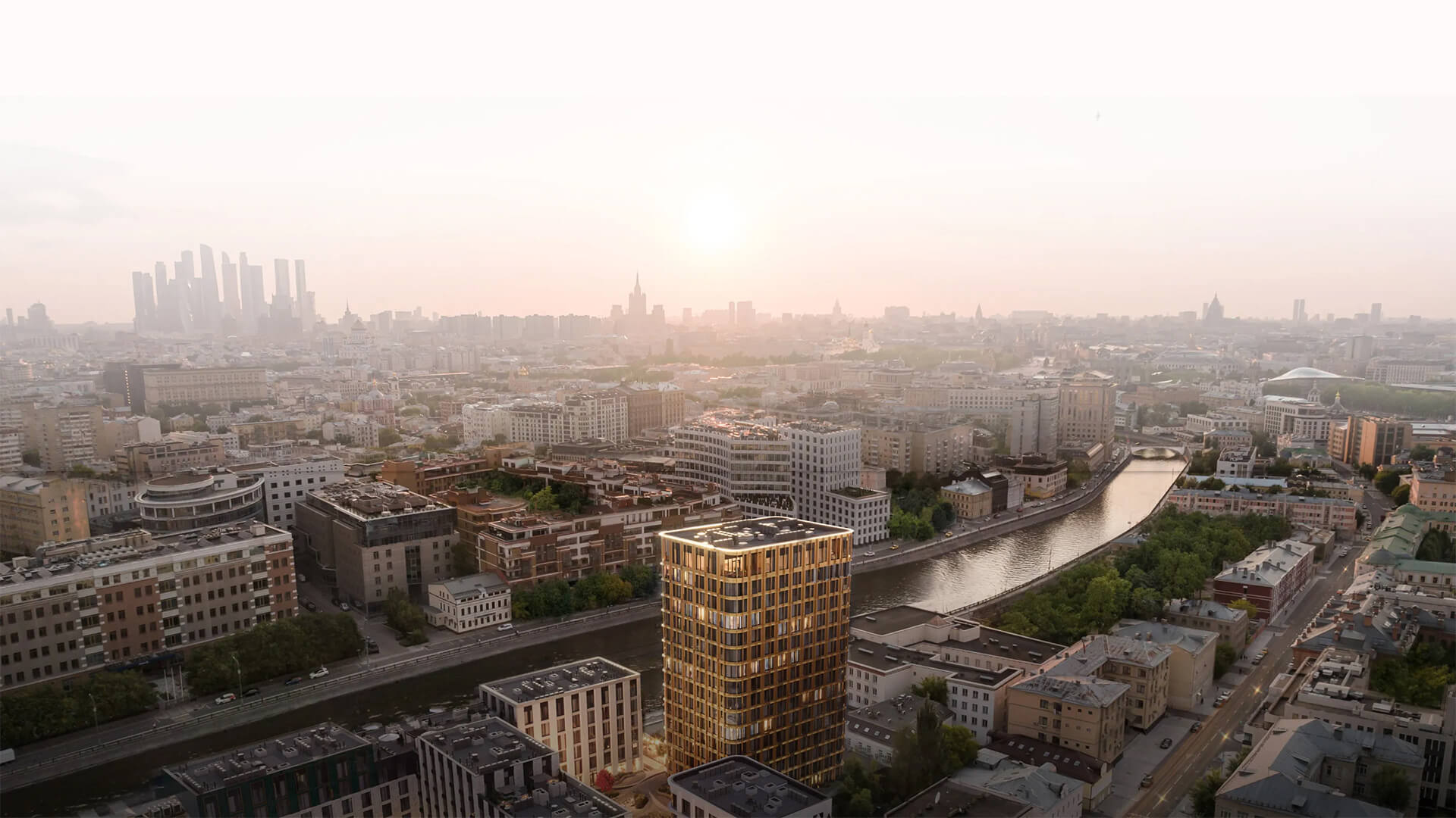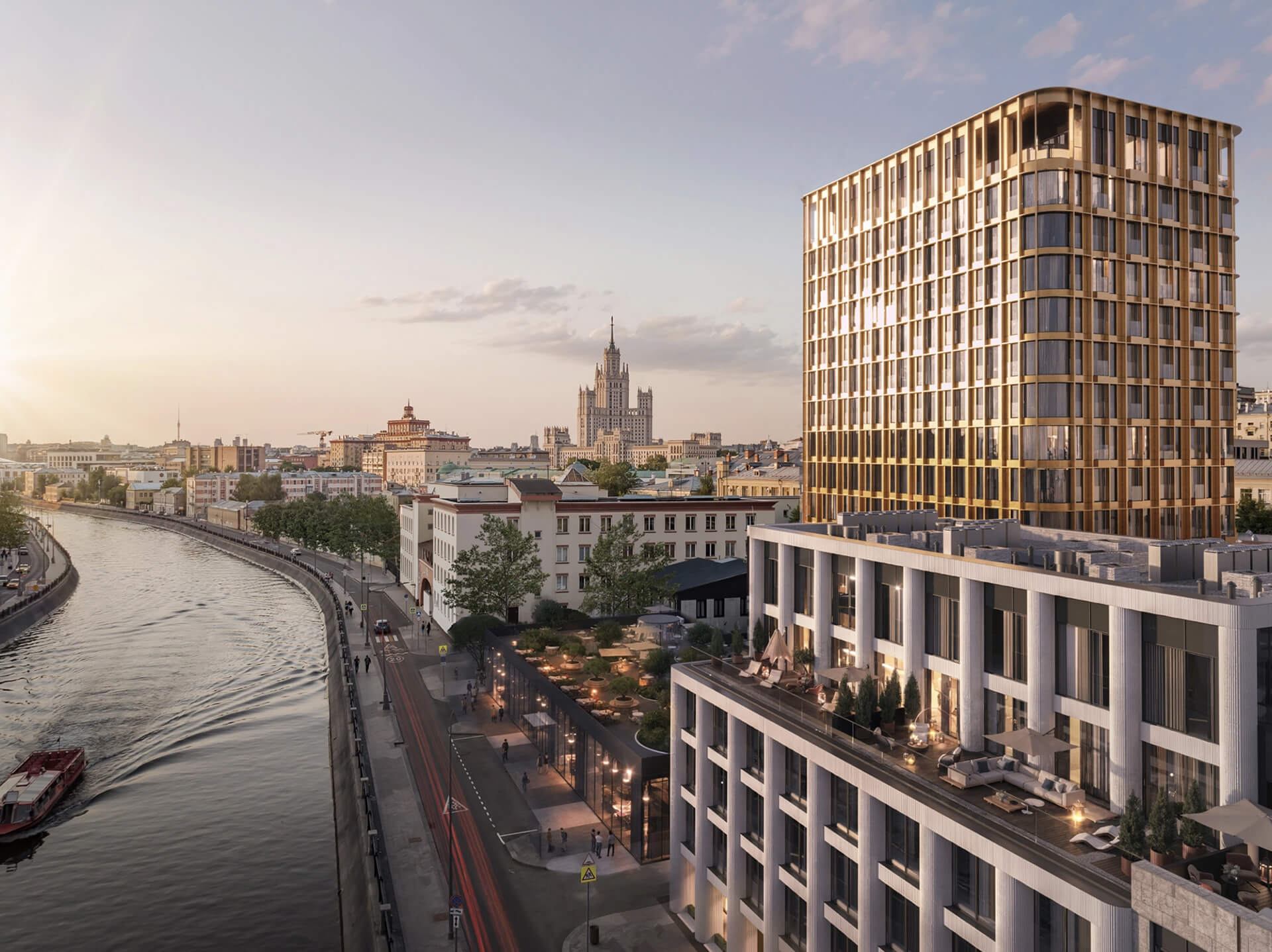 Корпус АРКТУР — самый высокий в комплексе, названный в честь летней звезды. Лето — время ярких, длинных дней, и с террас этого корпуса открываются виды на сияющие купола Кремля и храмы Замоскворечья. Медные обрамления панорамных окон придают фасаду солнечное тепло и блеск.