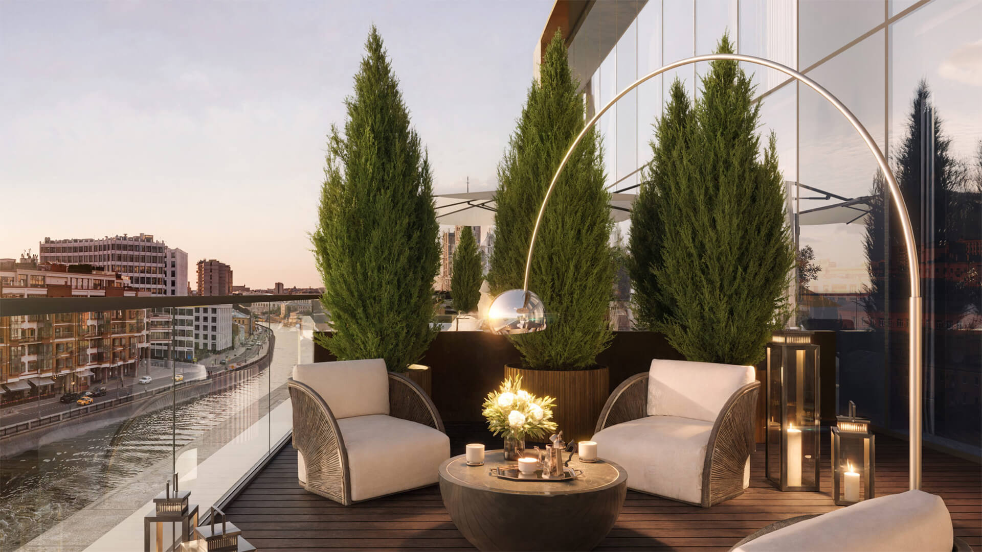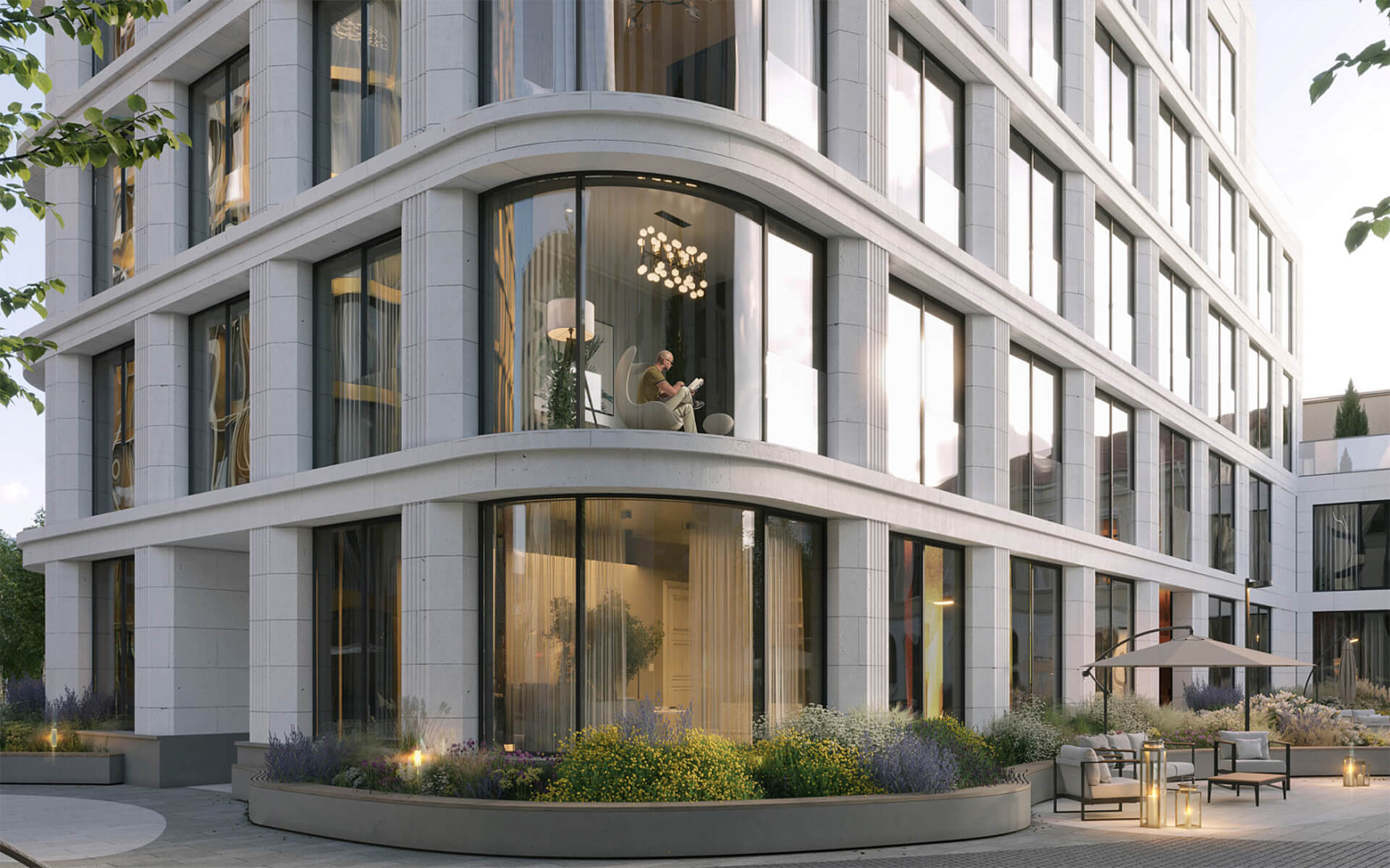 Высокие потолки в сочетании с панорамными окнами наполняют комнаты светом и воздухом, а пропорции интерьеров, созданные по законам золотого сечения, создают ощущение идеального баланса. Окна и террасы резиденций обращены либо на набережную, либо на приватный сад, что является редкой привилегией для центра Москвы. Умное расположение корпусов исключает неприятные виды «окна в окна», а уже с пятого этажа открываются живописные панорамы Замоскворечья, с верхних уровней видны башни Кремля.